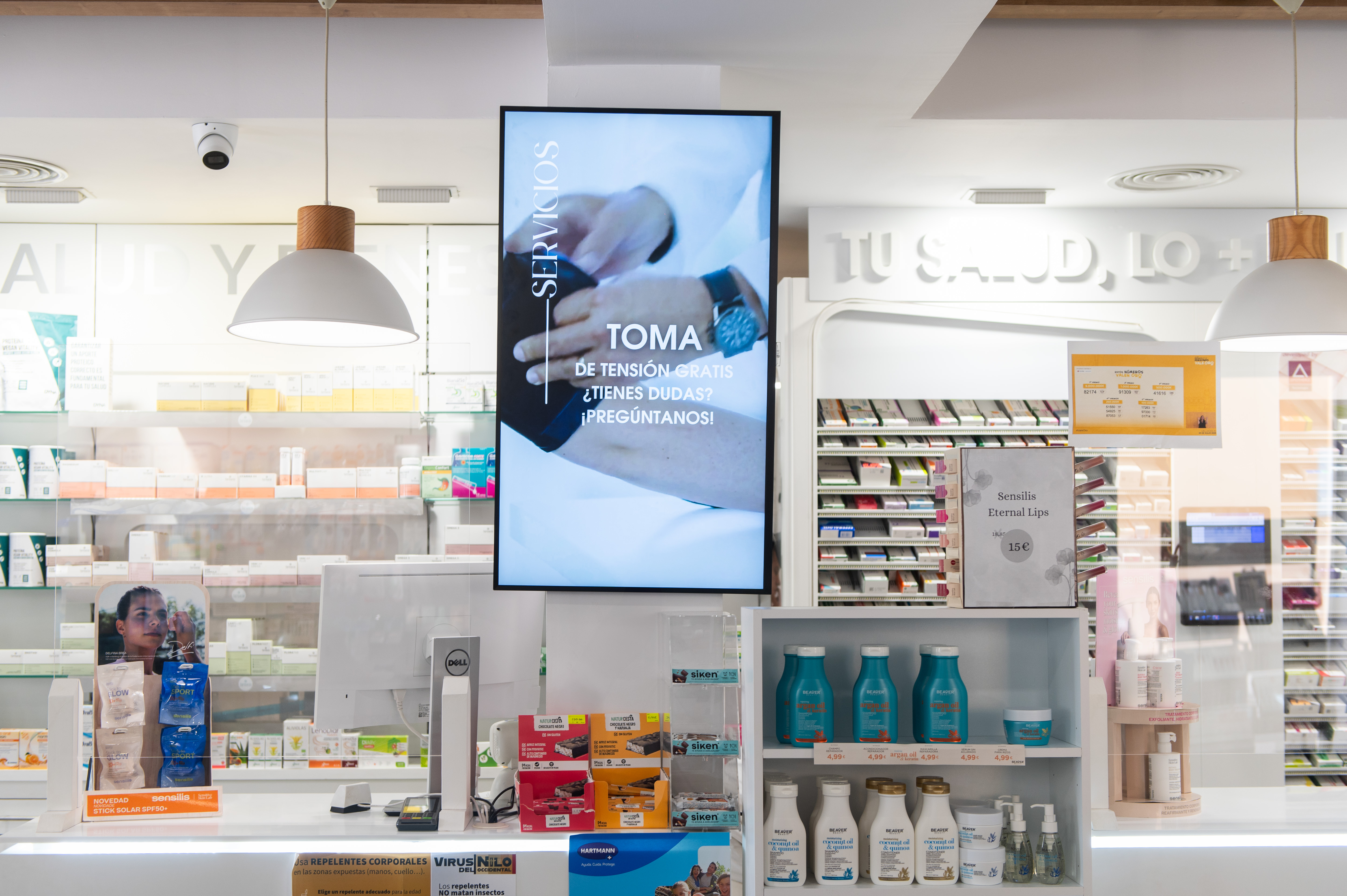 Las pantallas de escaparate son la herramienta más directa y eficaz para atraer miradas desde la calle y ampliar el alcance de tu farmacia en todo su entorno.